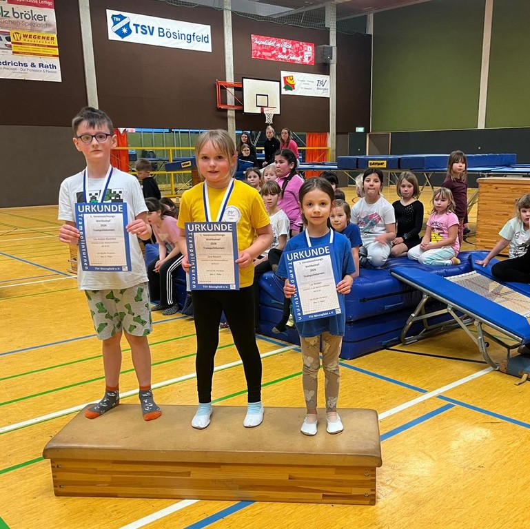 Der erste Sichtungswettkampf 2026 der Trampoliner des TSV Bösingfeld fand am 29.01.26 statt. Während der normalen Trainingszeit konnten die Kinder teilnehmen, welche die 10-teilige P3-Übung zeigen konnten. Wie auch bei den großen Wettkämpfen üblich, wurden neben den Haltungsnoten auch die Sprunghöhe der einzelnen Sprünge und die Landungen außerhalb der Trampolinmitte über ein elektronisches Messverfahren ermittelt.